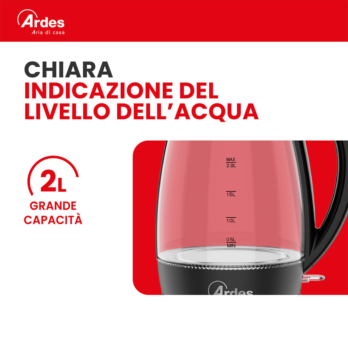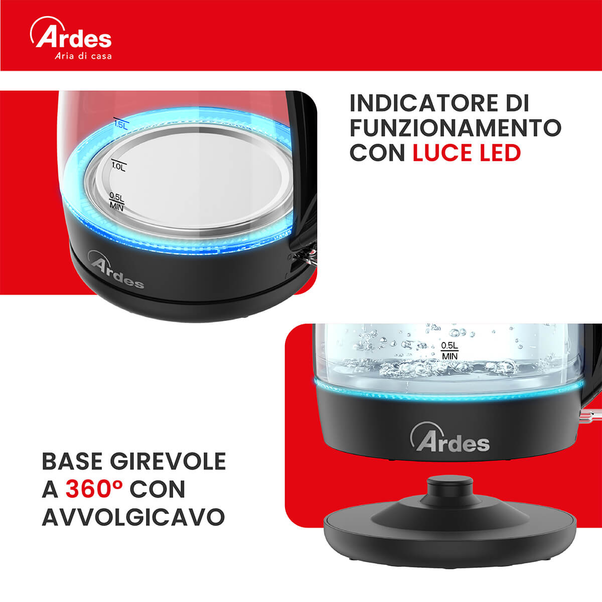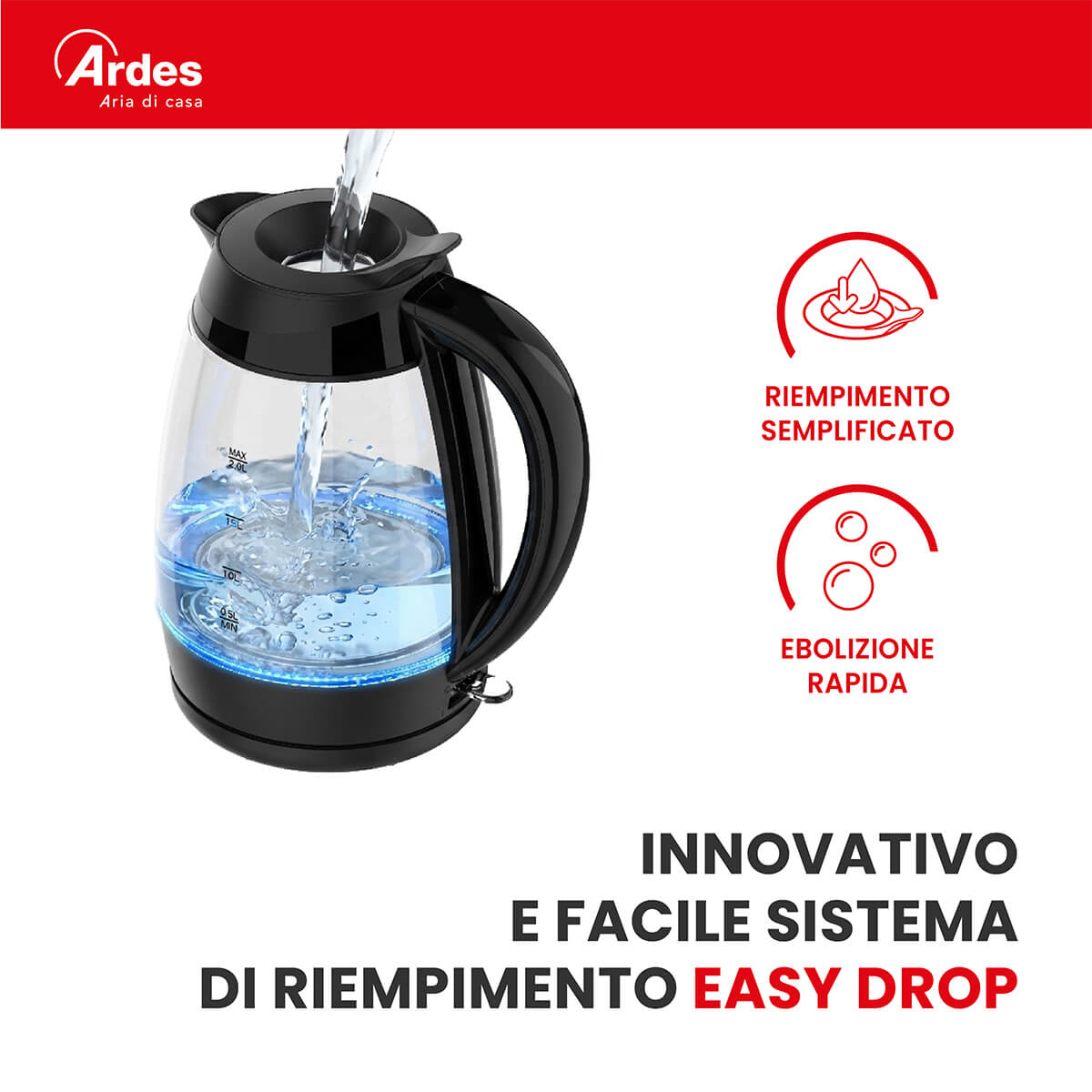 Bollitore elettrico in vetro con elegante e intuitiva spia luminosa a LED blu. Capacità 2L 8 tazze. Il bollitore si spegne automaticamente quando lacqua raggiunge lebollizione, quando viene sollevato dalla base o quando lacqua non è sufficiente. Filtro anticalcare, removibile e lavabile. Facile riempimento diretto dal coperchio grazie allinnovativo sistema Easy Drop. Lampia apertura semplifica la pulizia. Il beccuccio versa lacqua senza gocciolare e ha un bordo liscio. Base girevole a 360° con avvolgicavo.