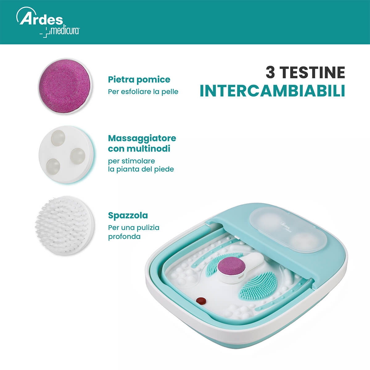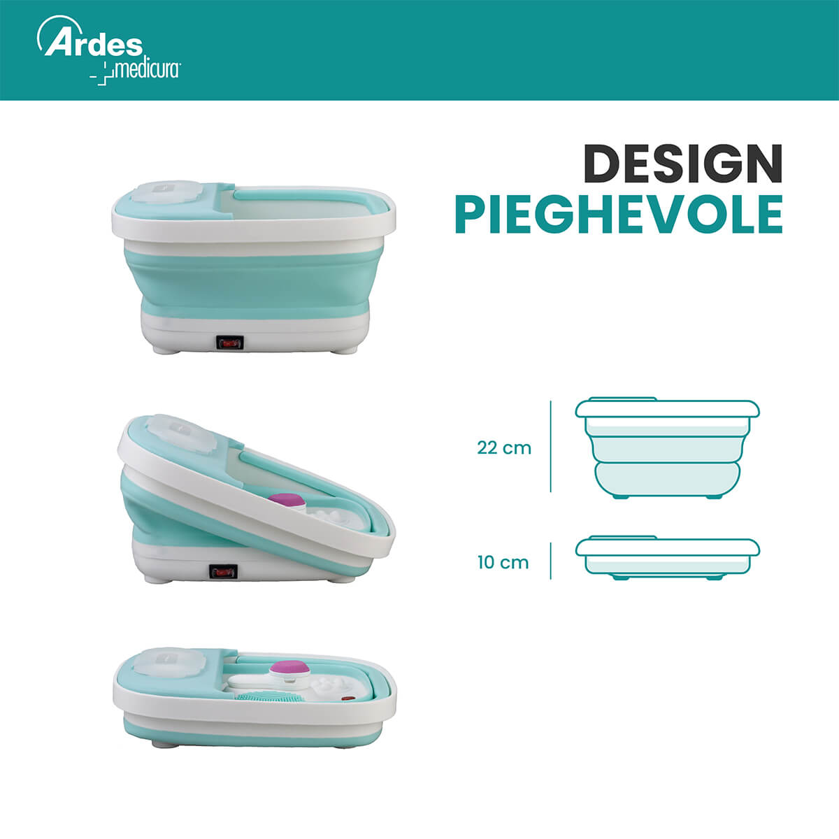 Idromassaggiatore per piedi pieghevole. Combina riscaldamento, idrobolle rilassanti e nodi per riflessologia plantare, eliminando laffaticamento e rigenerando i piedi affaticati. Il sistema di riscaldamento scalda e mantiene lacqua costantemente a 40°C per un comfort ottimale. Include accessorio con 3 testine intercambiabili: massaggiatore con multinodi per stimolare la pianta del piede, pietra pomice per esfoliare la pelle e spazzola per una pulizia profonda. Il design pieghevole salvaspazio riduce laltezza da 22 a soli 10 cm. Maniglia per il trasporto. Semplice e comodo da usare.