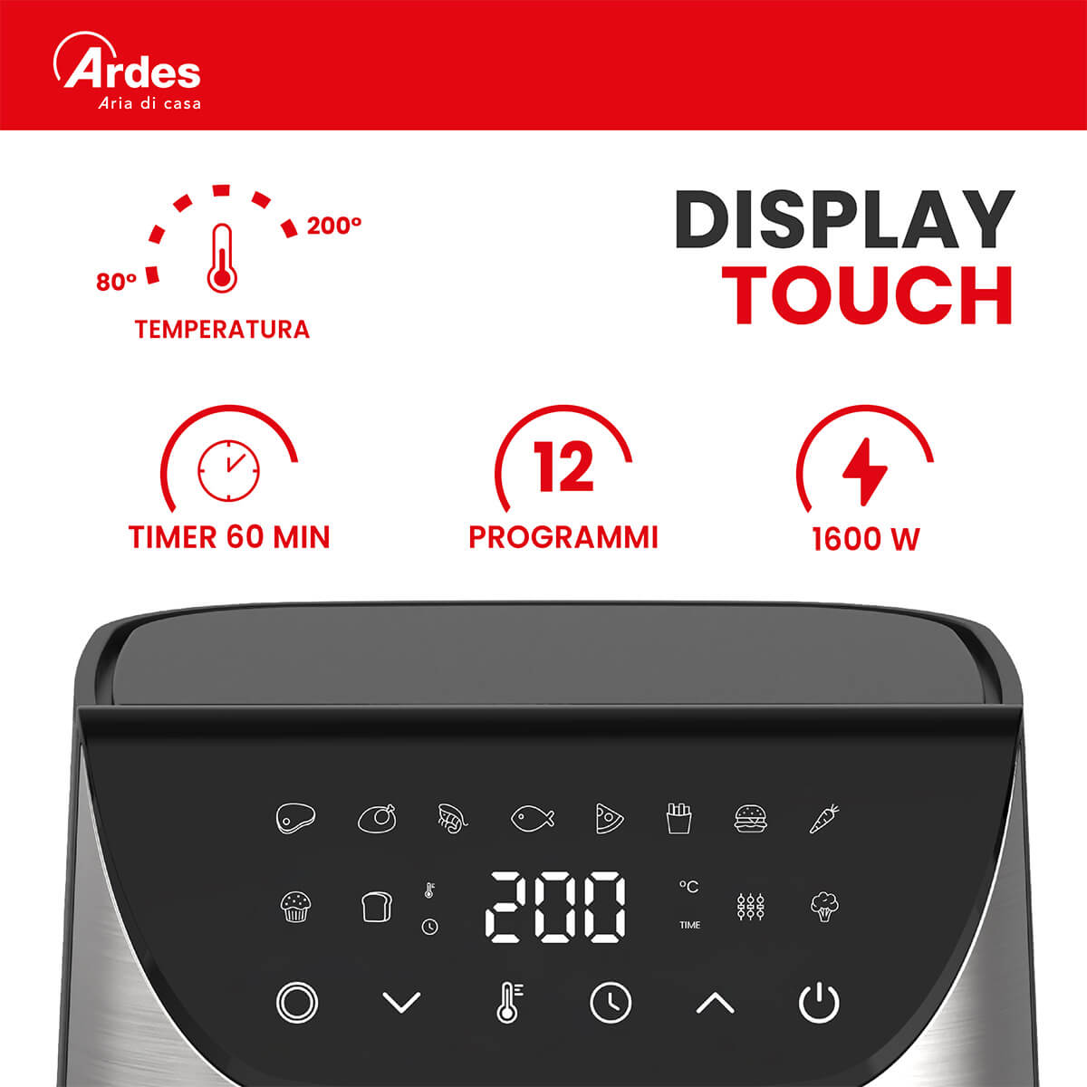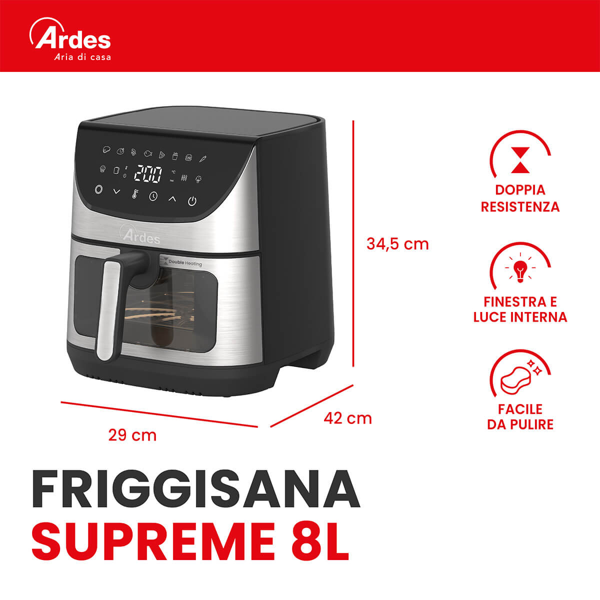 Quello che si può friggere o cuocere in forno, si può cucinare anche con Friggisana Supreme 8L. La finestra e la luce interna permettono di monitorare la cottura del cibo senza aprire il cestello. Cottura uniforme e nessun bisogno di scuotere il cibo grazie alla doppia resistenza. La Tecnologia Rapid Air permette di generare un flusso di aria calda in grado di cuocere uniformemente e velocemente un gran numero di piatti. Può cuocere senza olio o con l80% di olio in meno rispetto a una friggitrice tradizionale. Minor consumo dolio, minori odori in cucina. Facile da pulire, grazie alla griglia e al contenitore antiaderenti. Griglia 25,2 x 25,2 cm. Pareti interne in acciaio. Display digitale touch, 12 programmi di cottura preimpostati. Temperatura regolabile 80200 °C. Timer 60 minuti.