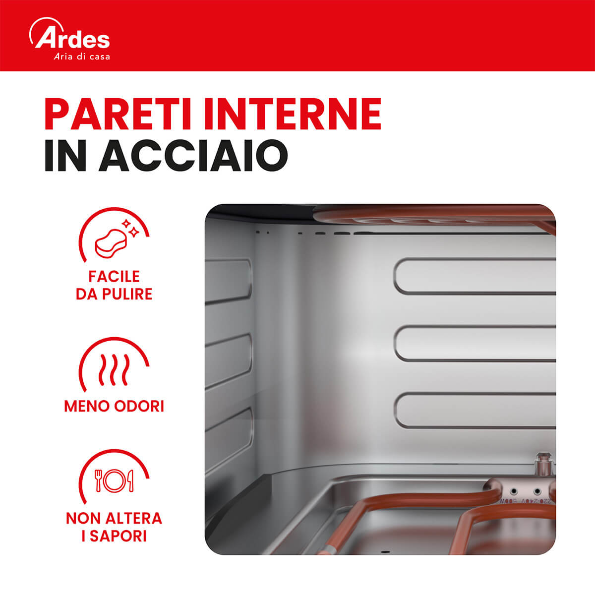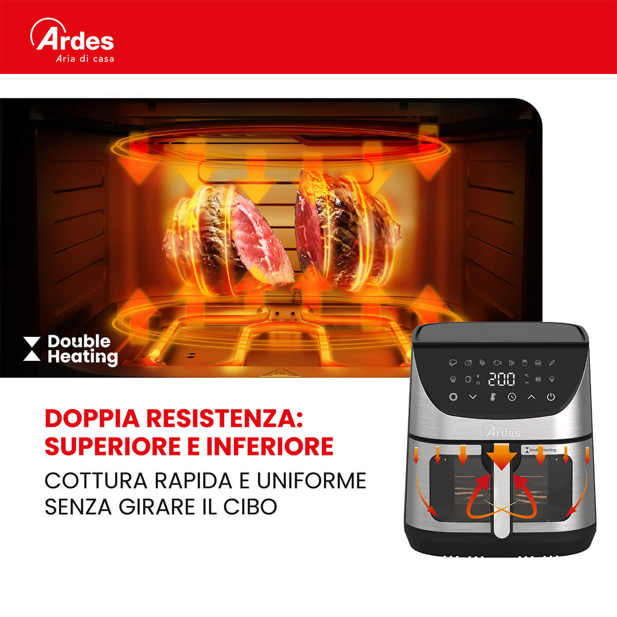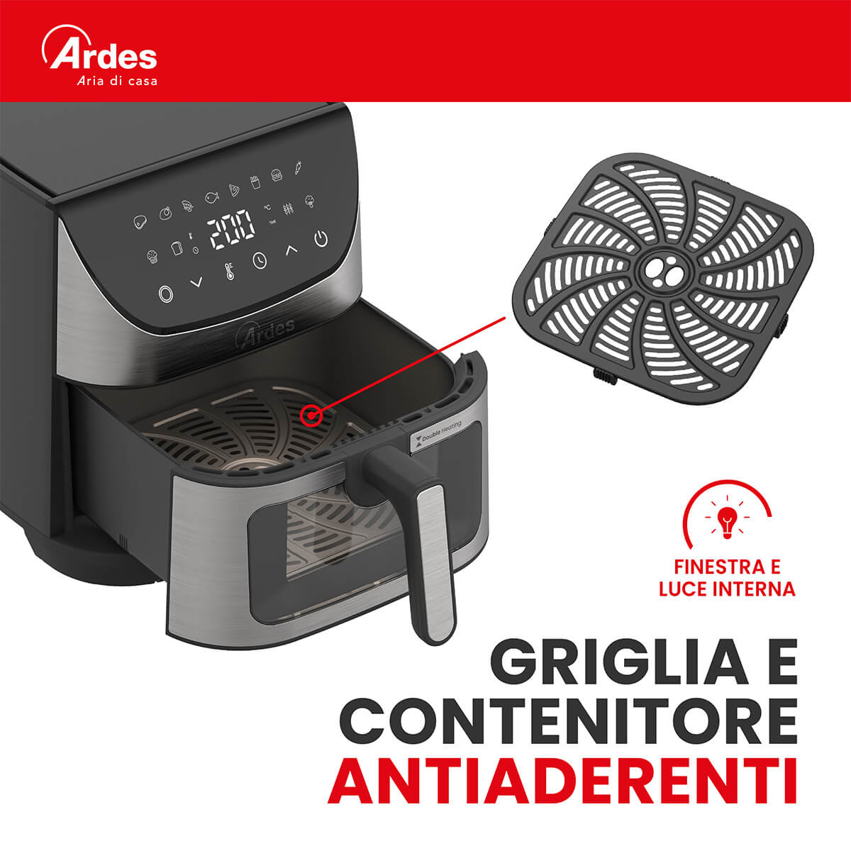 Friggitrice ad aria con doppia resistenza. 12 programmi preimpostati. Finestra e luce interna. Capacità 8L. Potenza 1600W.