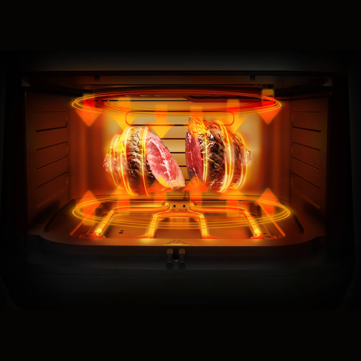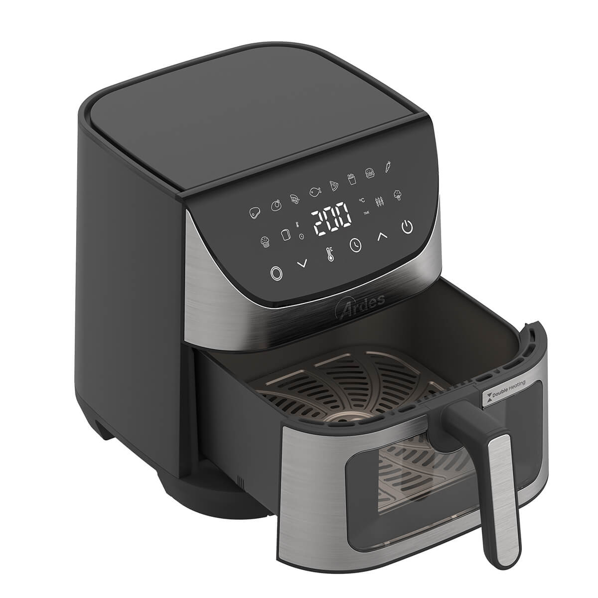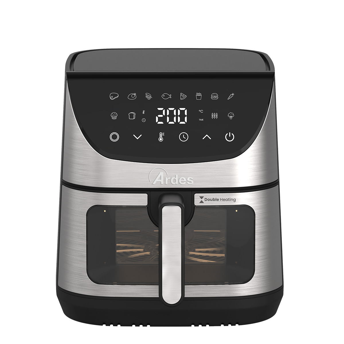 Friggitrice ad aria con doppia resistenza. 12 programmi preimpostati. Finestra e luce interna. Capacità 8L. Potenza 1600W.