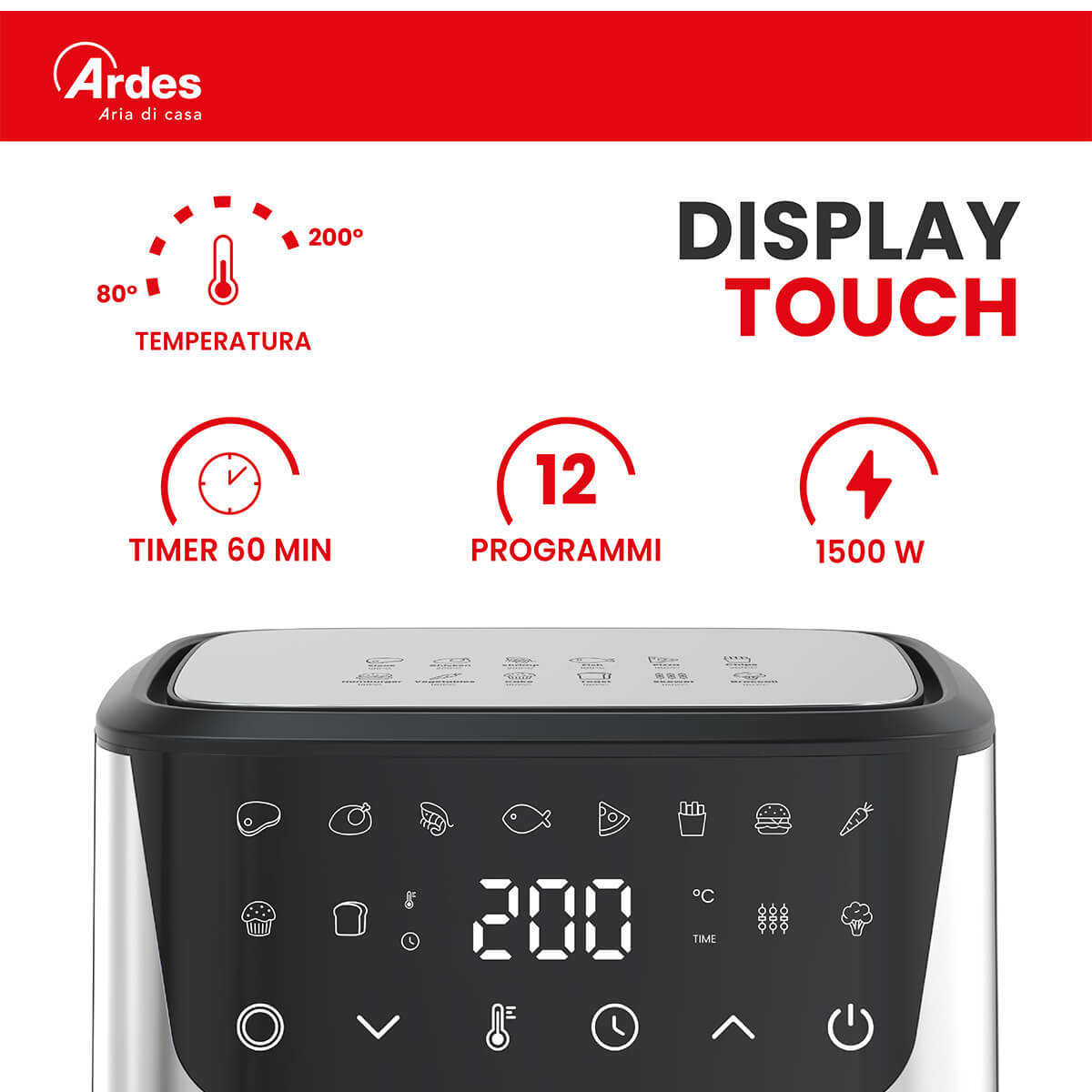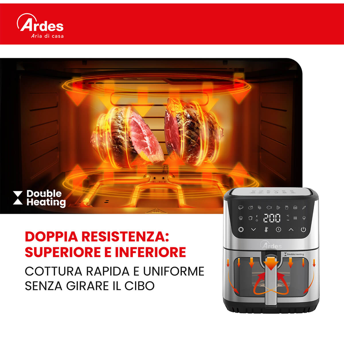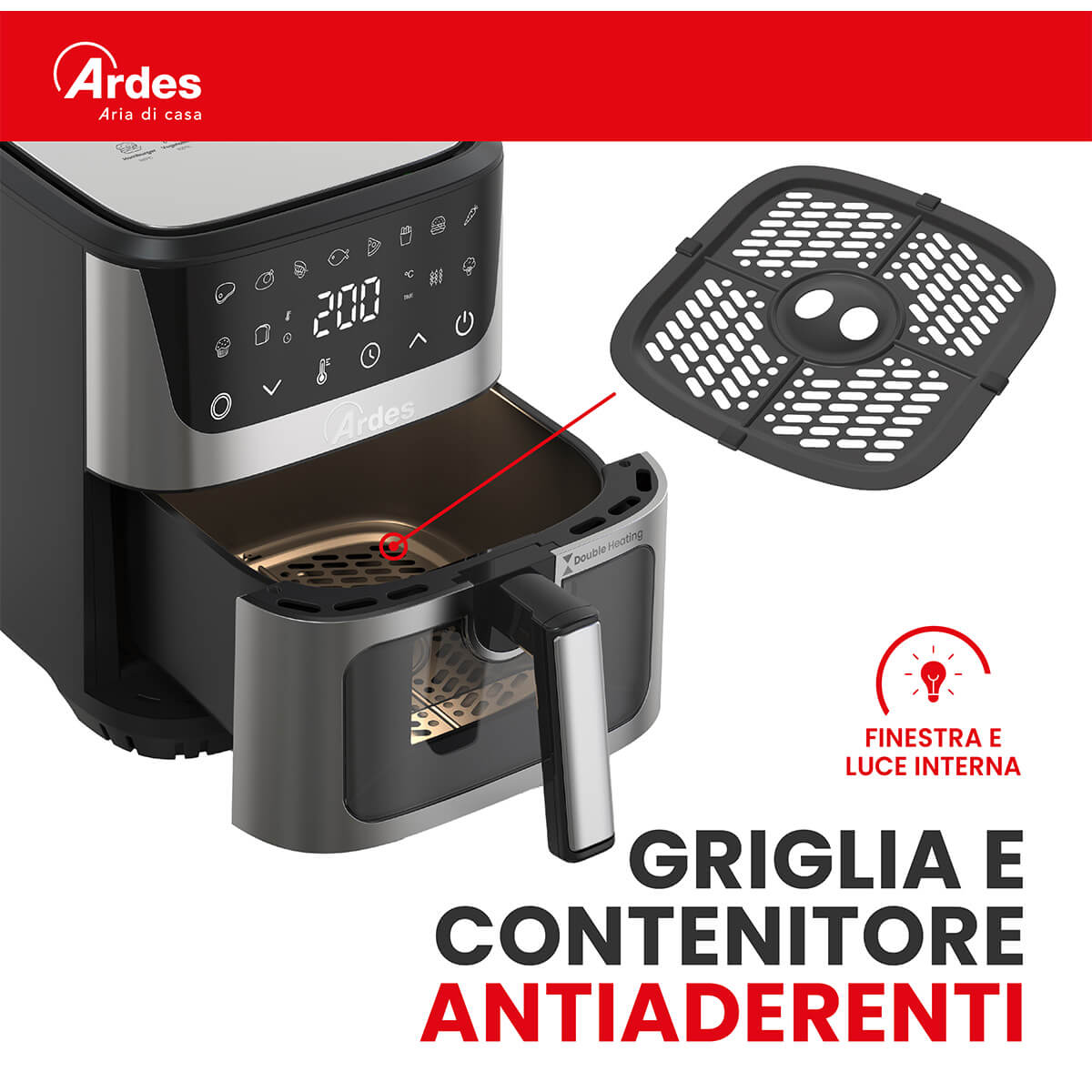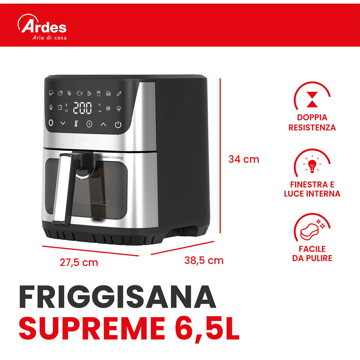 Friggitrice ad aria con doppia resistenza. 12 programmi preimpostati. Finestra e luce interna. Capacità 6,5L. Potenza 1500W.