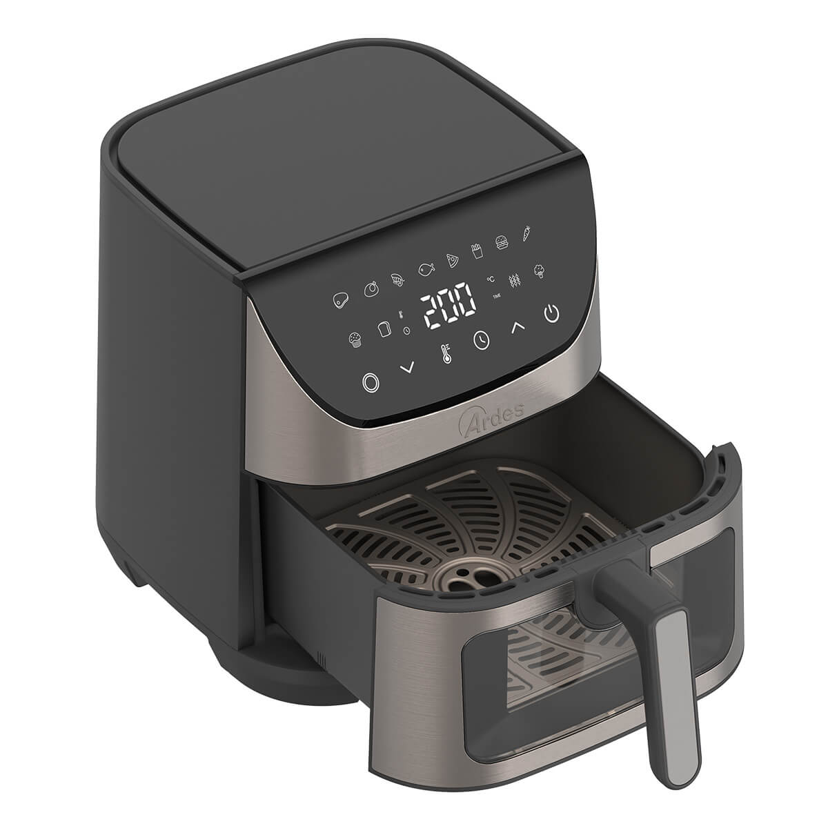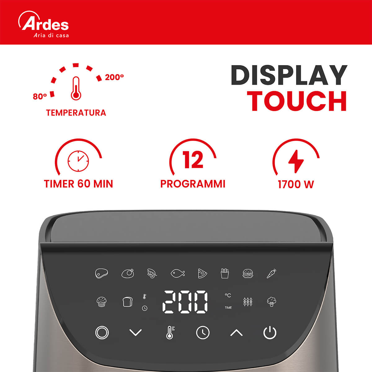 uniformemente e velocemente un gran numero di piatti. Può cuocere senza olio o con l80% di olio in meno rispetto a una friggitrice tradizionale. Minor consumo dolio, minori odori in cucina. Facile da pulire, grazie alla griglia e al contenitore antiaderenti. Griglia 25,2 x 25,2 cm. Pareti interne in acciaio. Display digitale touch, 12 programmi di cottura preimpostati. Temperatura regolabile 80200 °C. Timer 60 minuti.