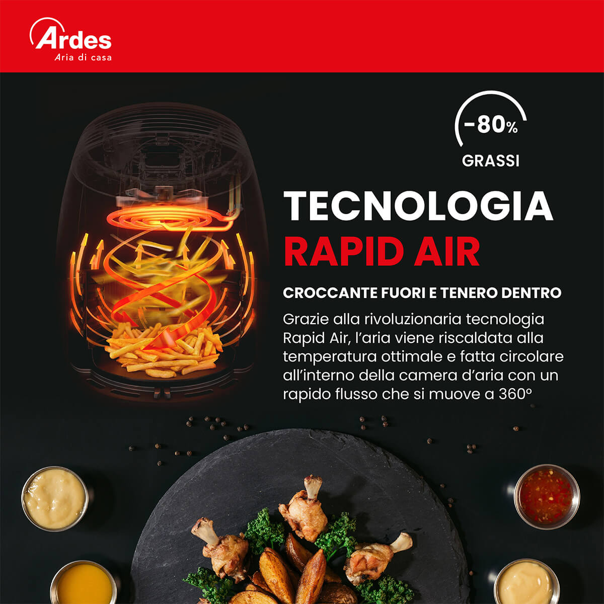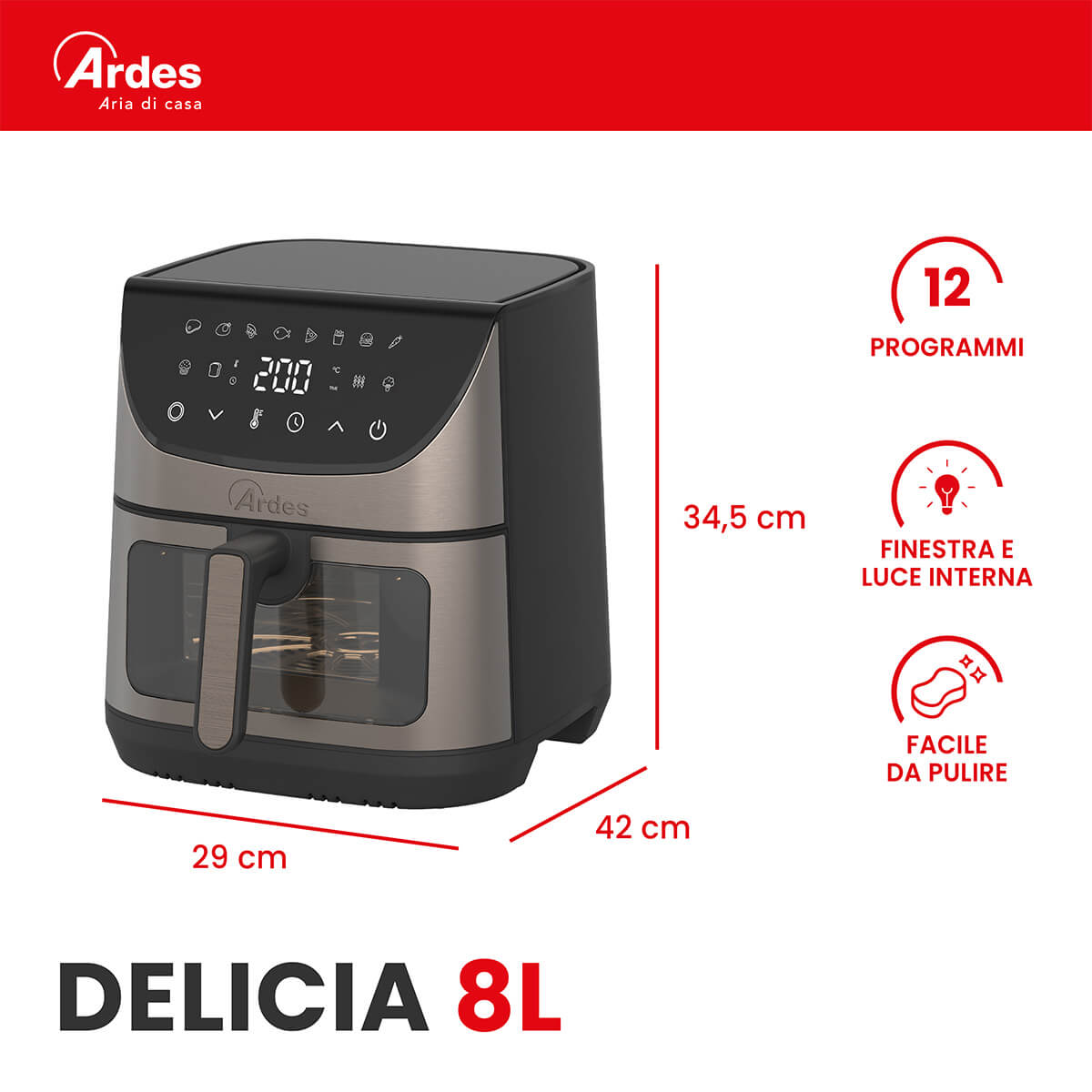 Quello che si può friggere o cuocere in forno, si può cucinare anche con Delicia 8L. La finestra e la luce interna permettono di monitorare la cottura del cibo senza aprire il cestello. La tecnologia Rapid Air permette di generare un flusso di aria calda in grado di cuocere