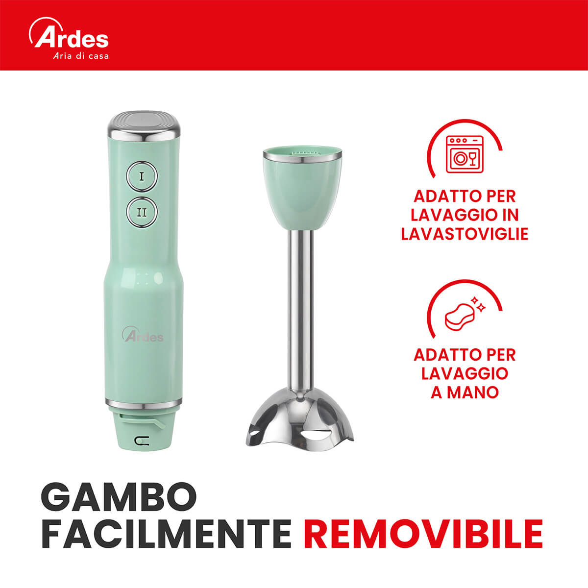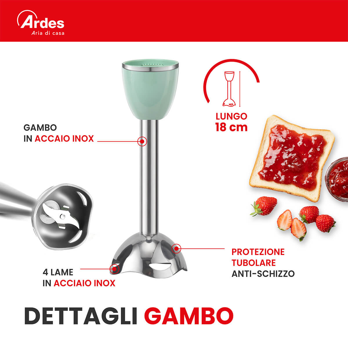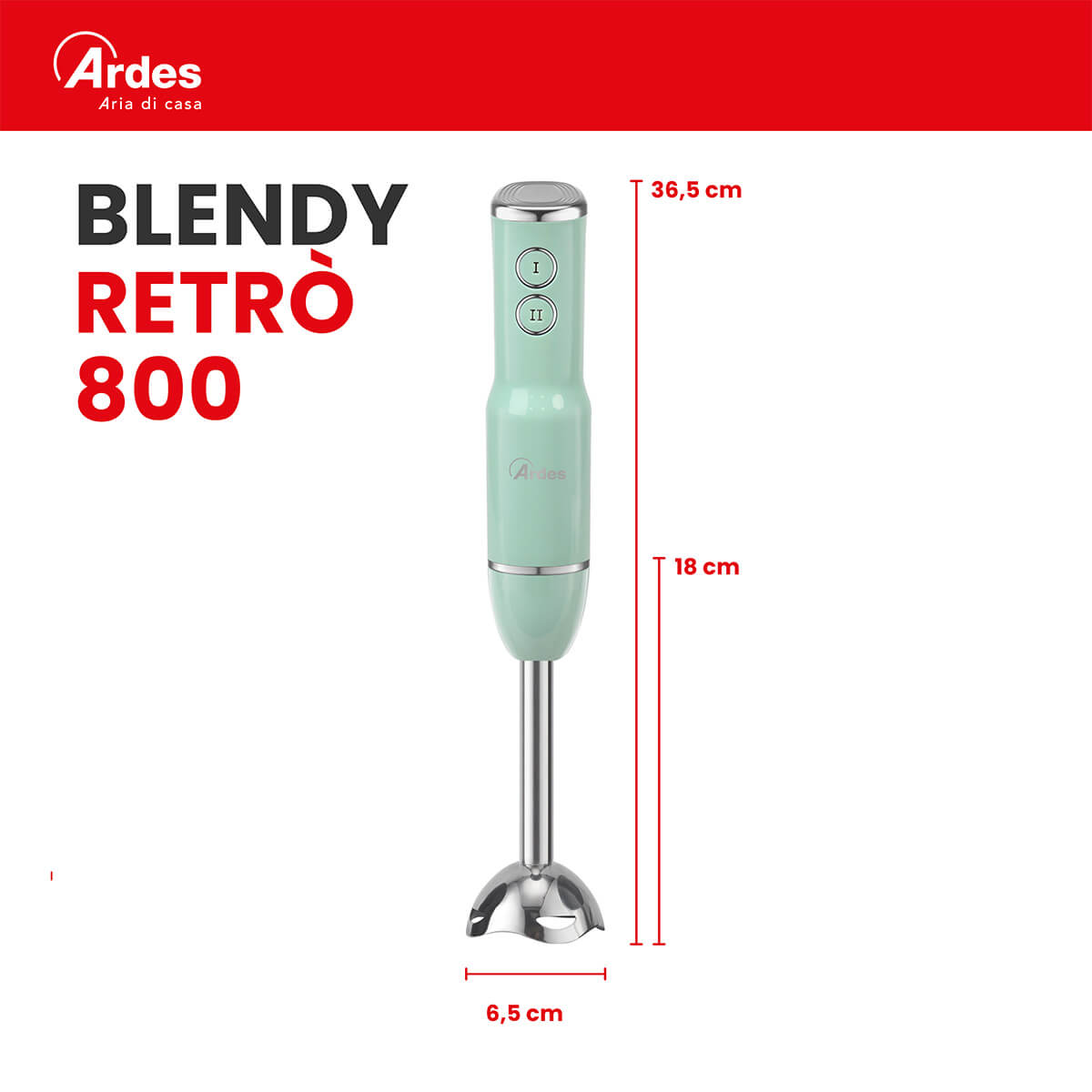 Frullatore ad immersione con gambo lungo 18 cm. Smontabile, facile da pulire. Gruppo lame in acciaio INOX con 4 lame. 2 velocità di funzionamento. 15500 giri al minuto. Impugnatura ergonomica.