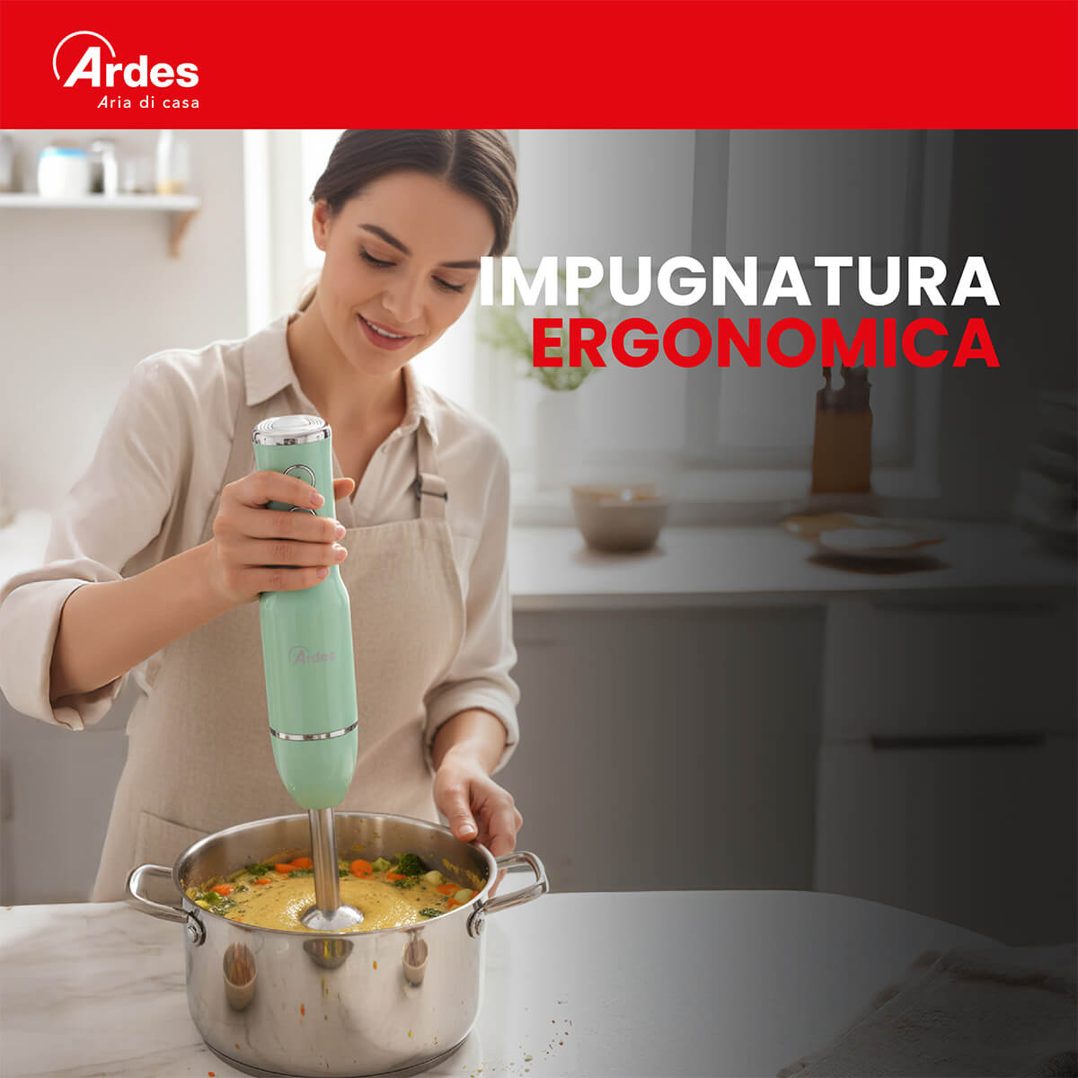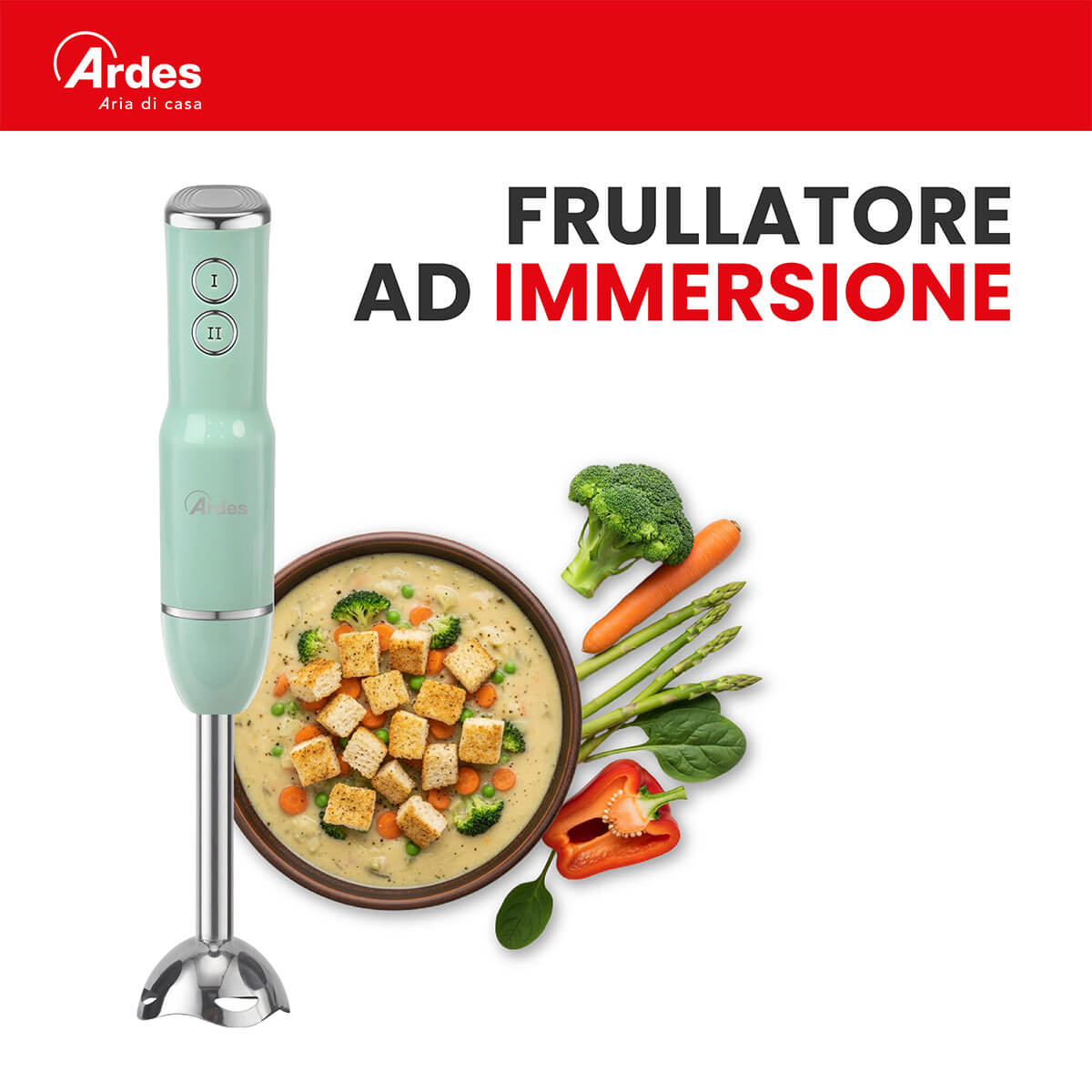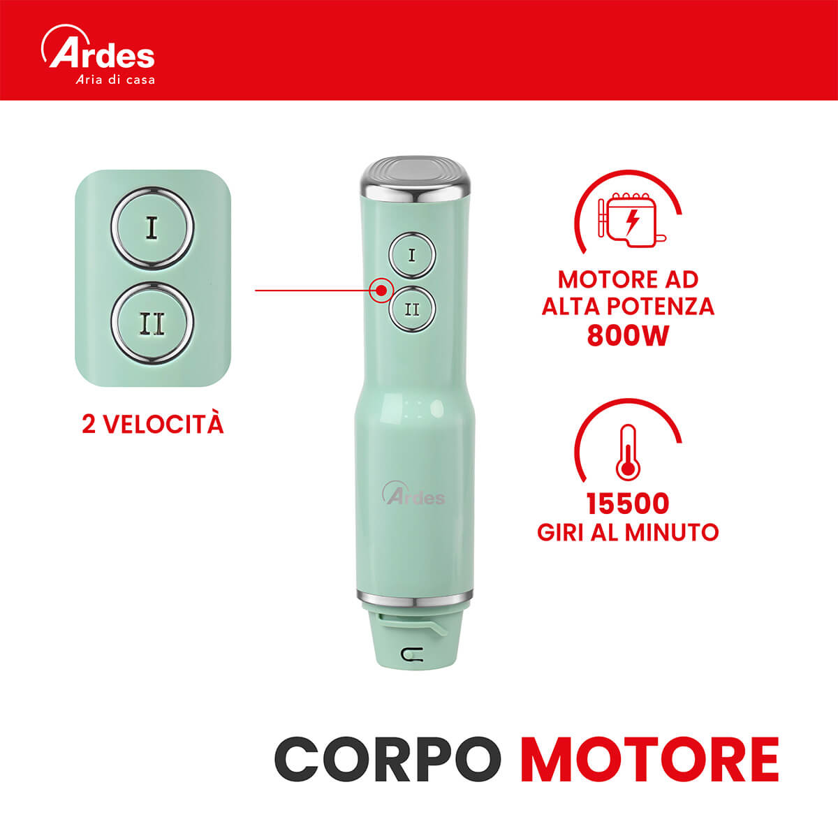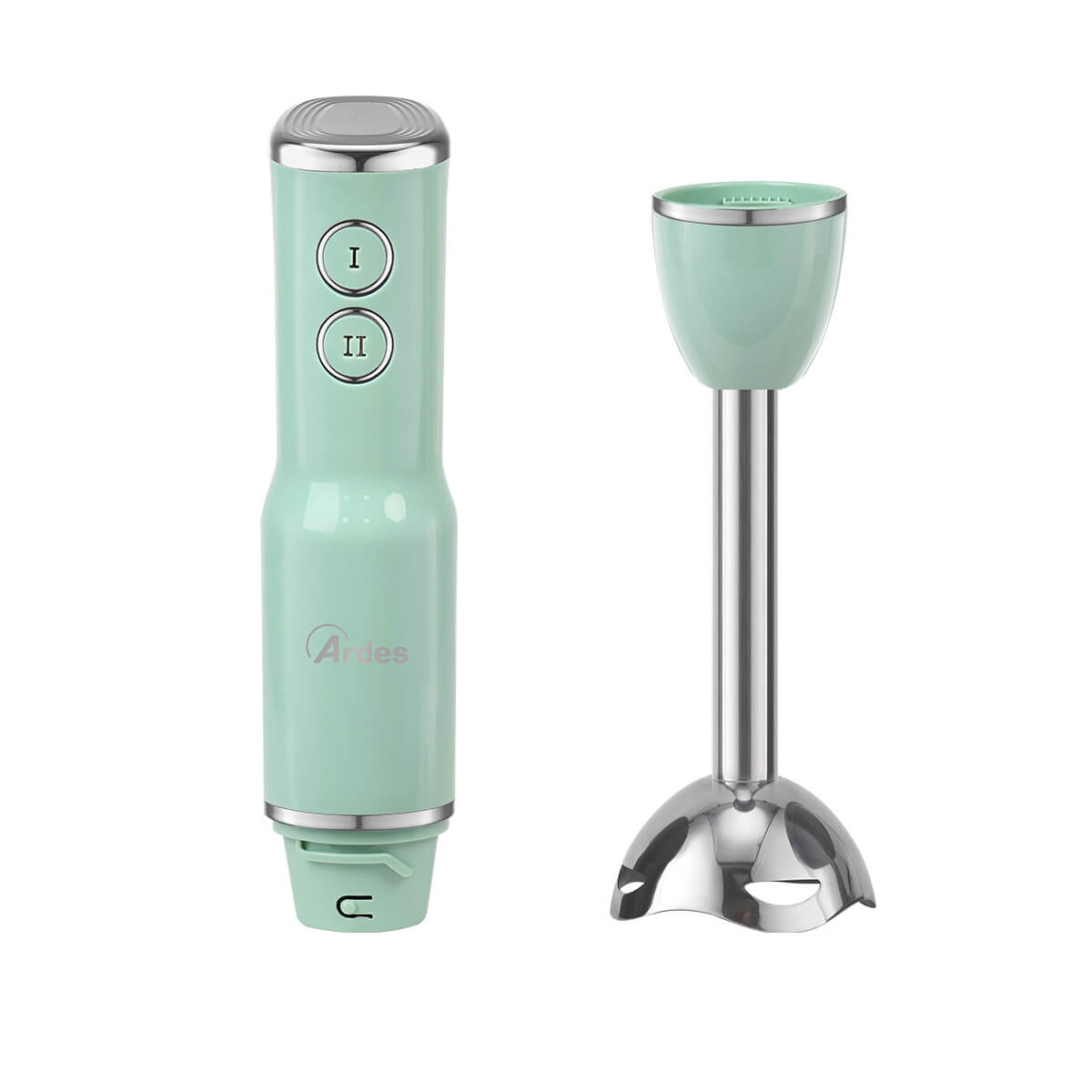 Frullatore ad immersione con gambo lungo 18 cm. Smontabile, facile da pulire. Gruppo lame in acciaio INOX con 4 lame. 2 velocità di funzionamento. 15500 giri al minuto. Impugnatura ergonomica.